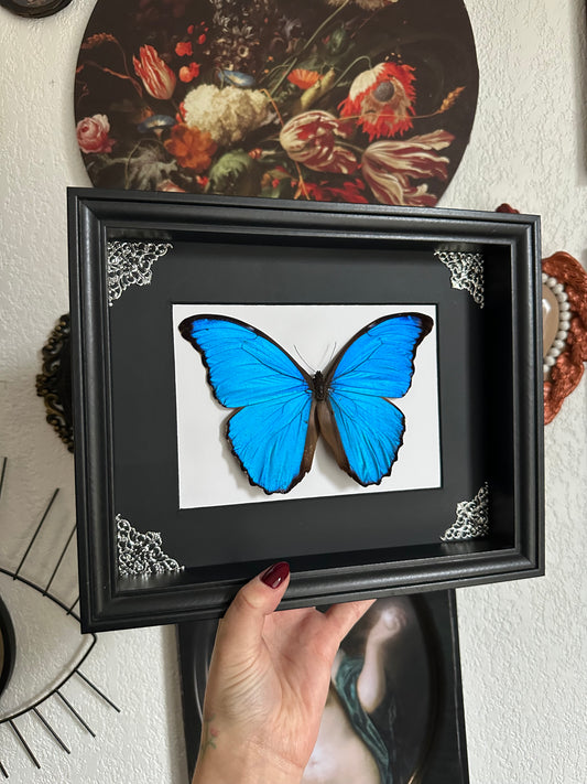 - 20% Halloween Collection – Superbe papillon bleu naturalisé sur fond argenté clair de lune