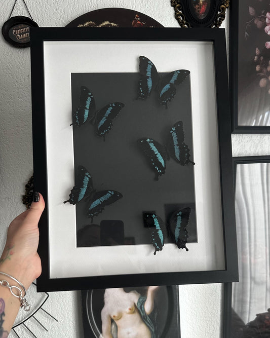 Envolée de papillons naturalisés bleus et noirs (Papilio oribasus)