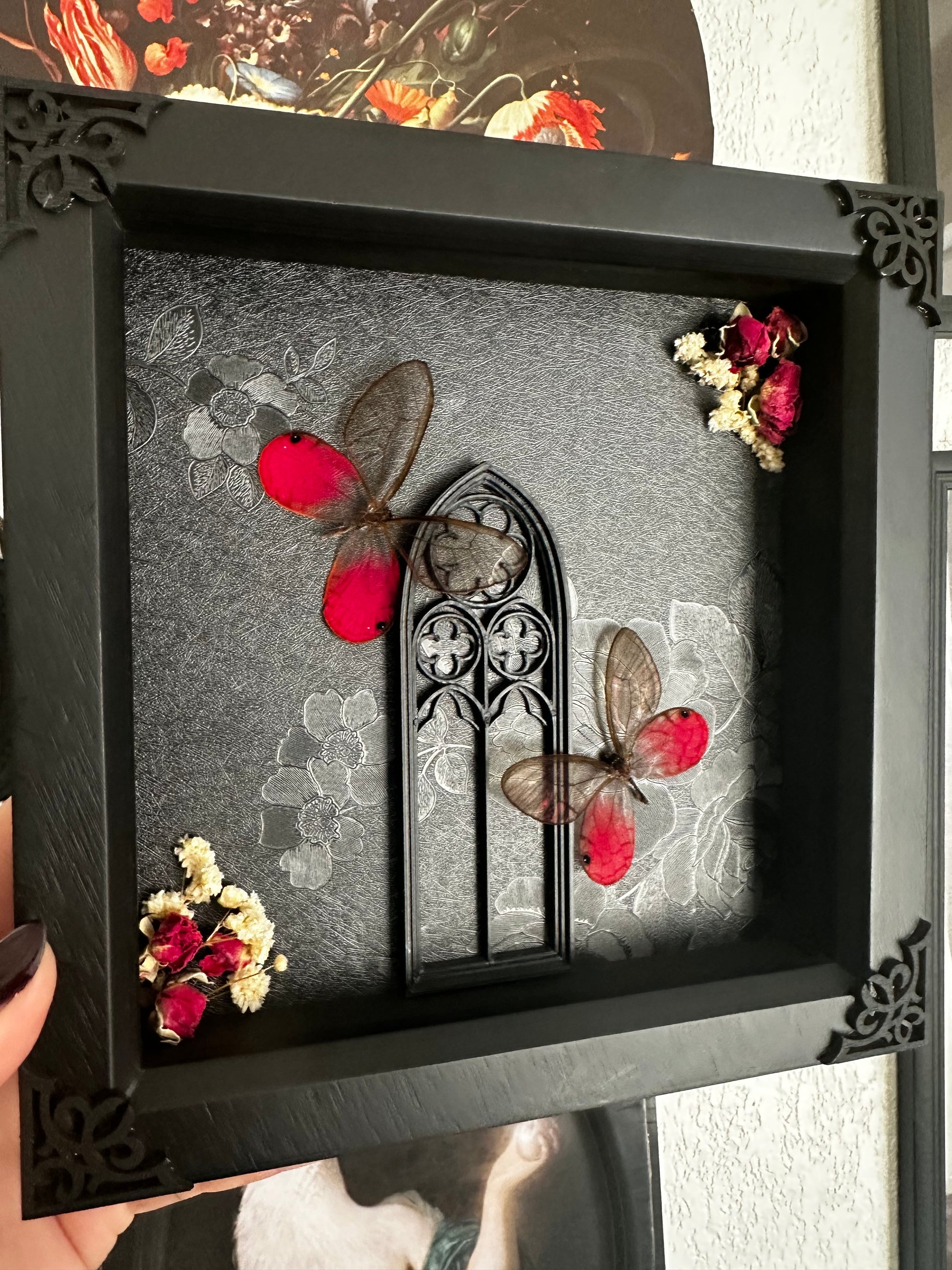 Très joli duo de deux papillons mâles Cithaerias aurorina ornementés d'une petite cathedrale gothique 3D et de fleurs séchées (boutons de roses..)