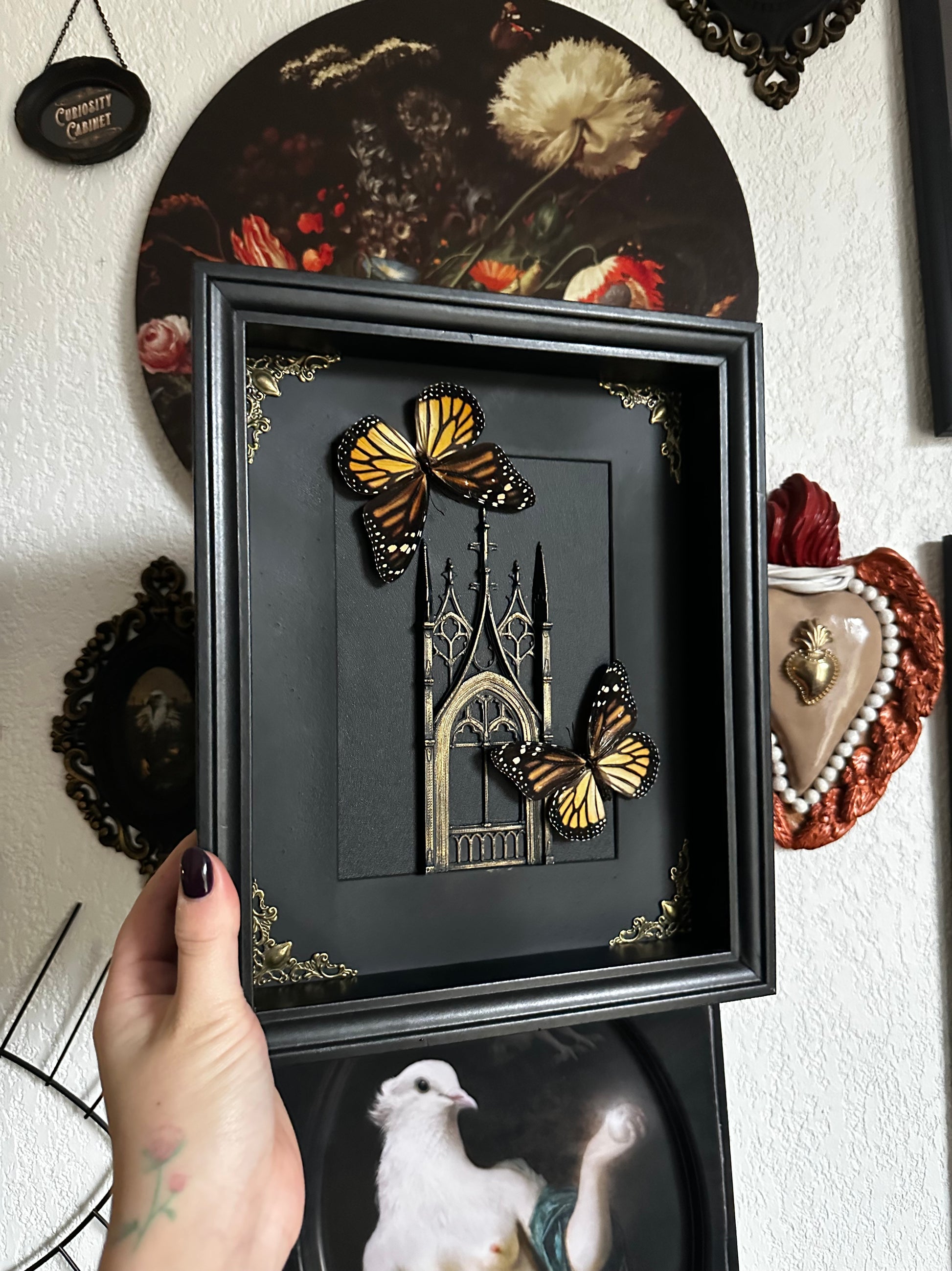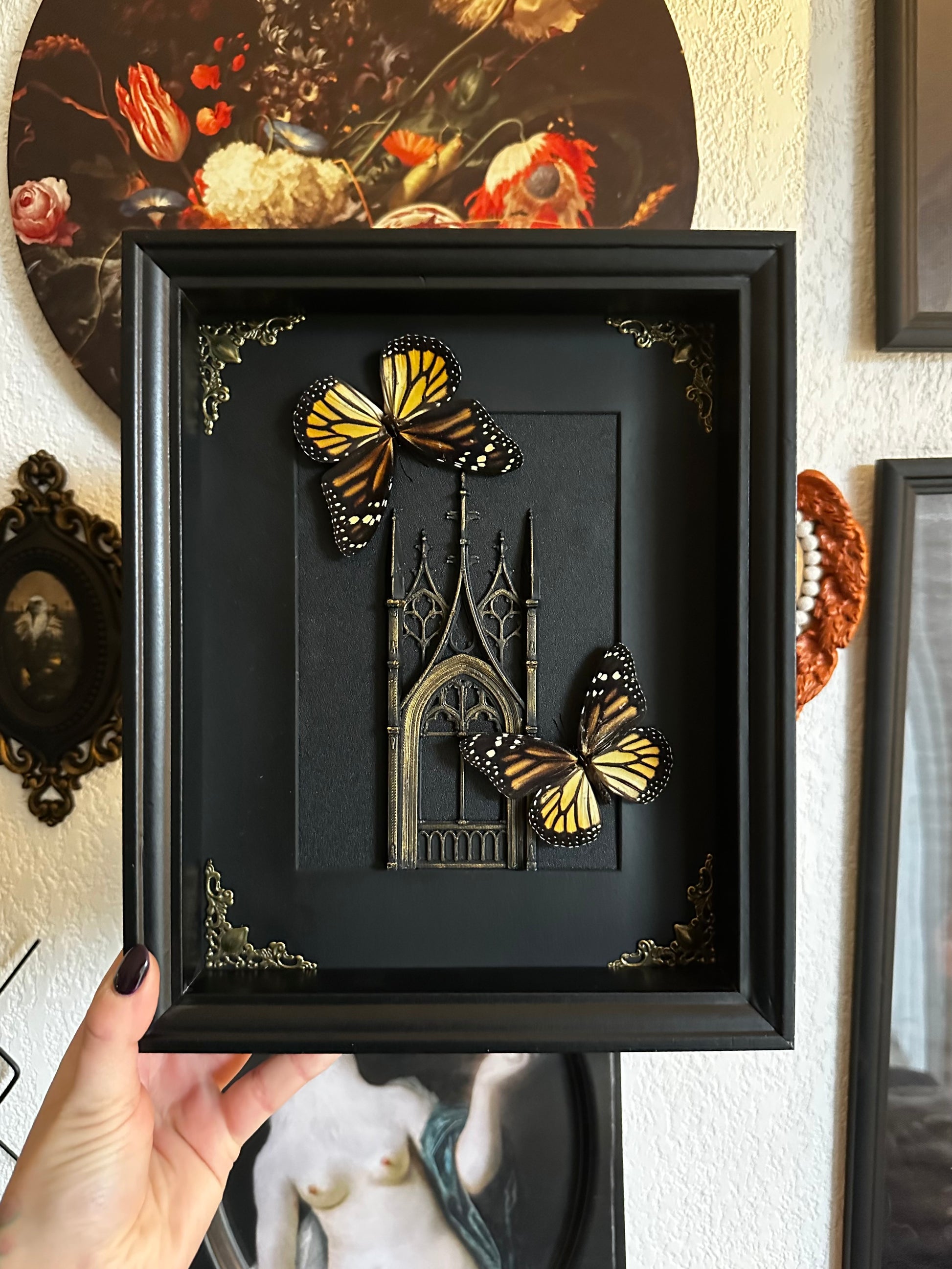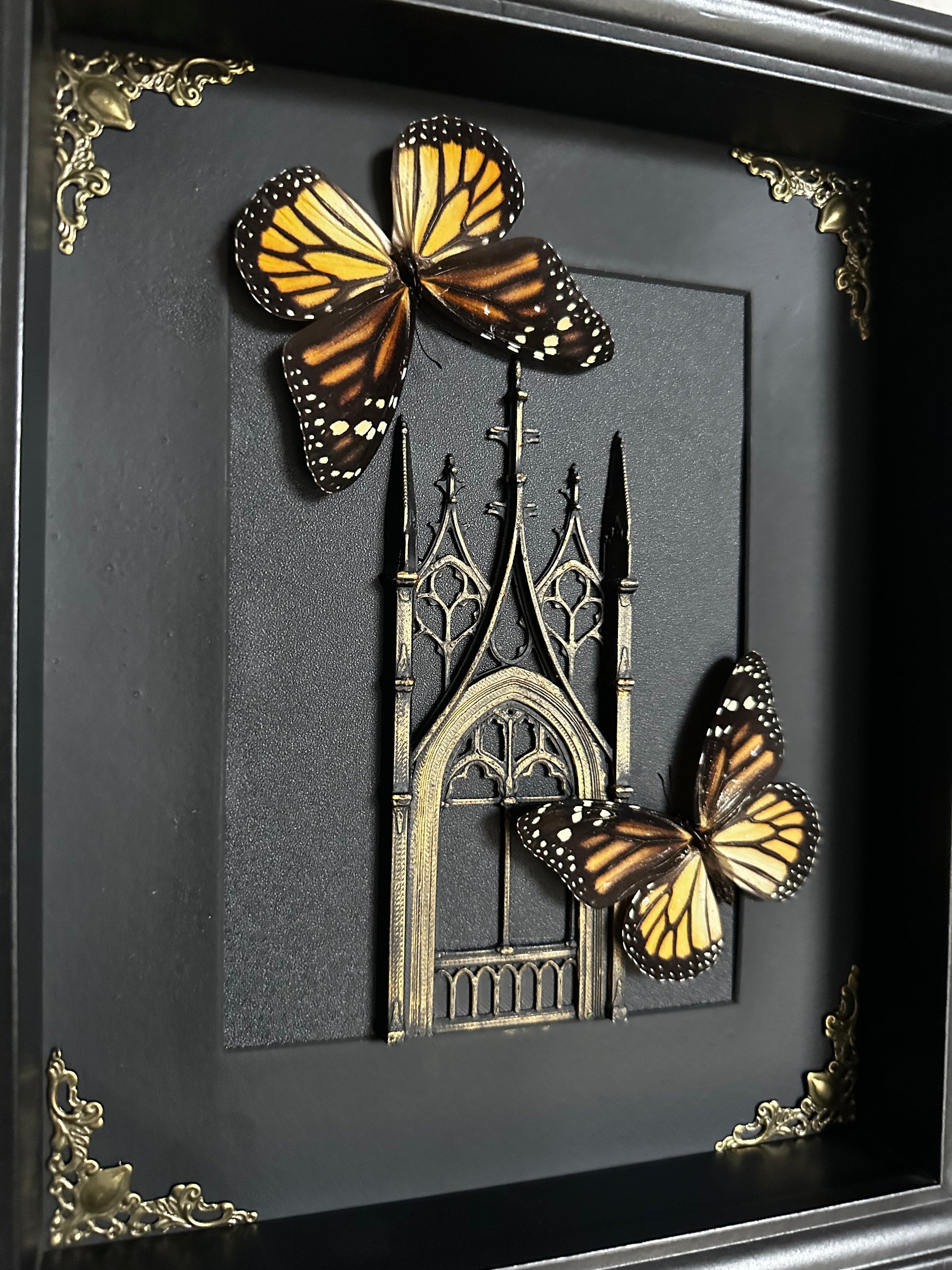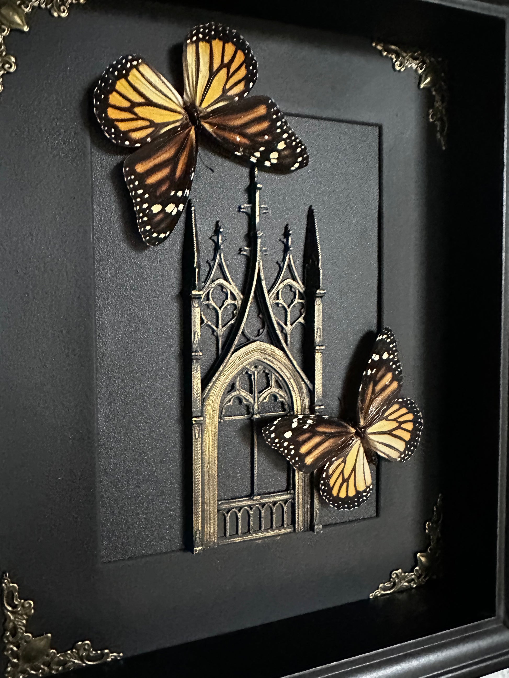Deux magnifiques papillons monarque femelles ou Danaus plexippus, le tout dans une composition avec une fenêtre d'architecture gothique légèrement dorée et des détails bronze.