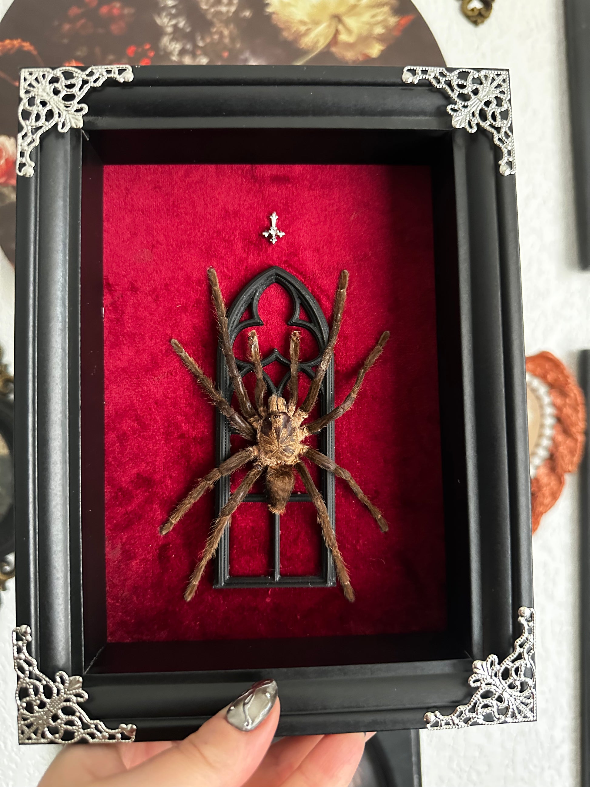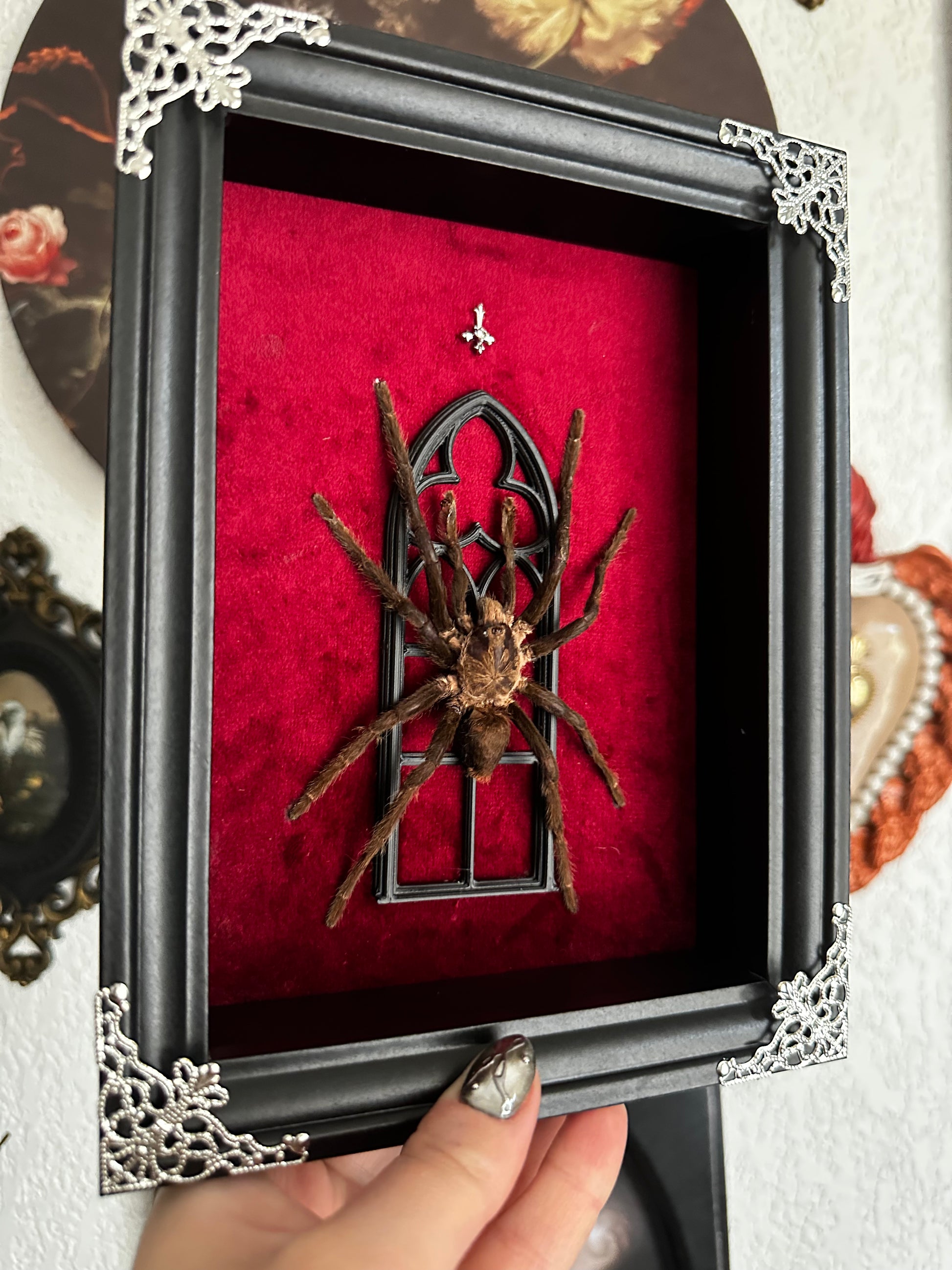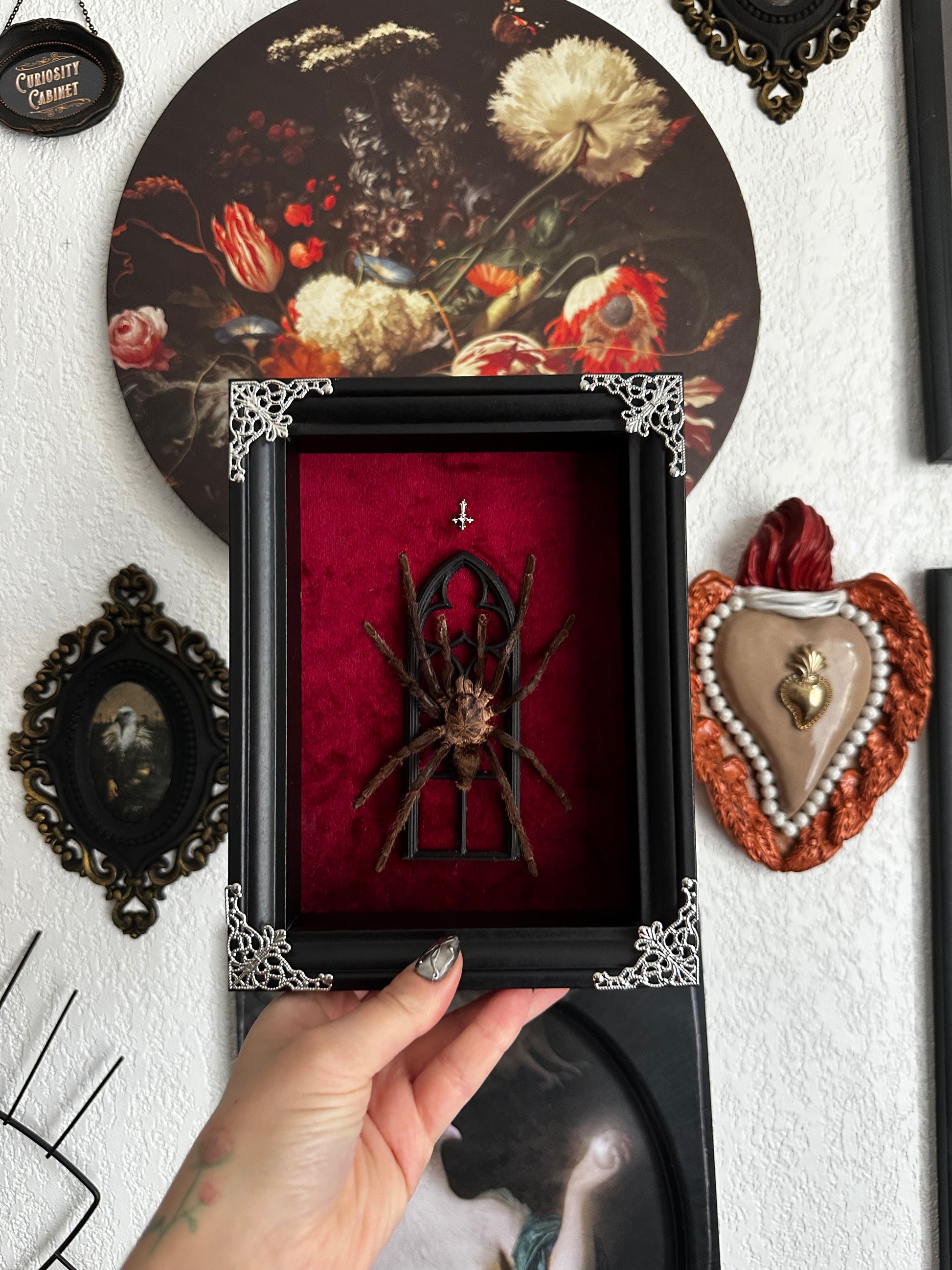 Petit mygale, Eurypelma spinicrus, sur fond de velours rouge, fenetre gothique 3D et petite croix.